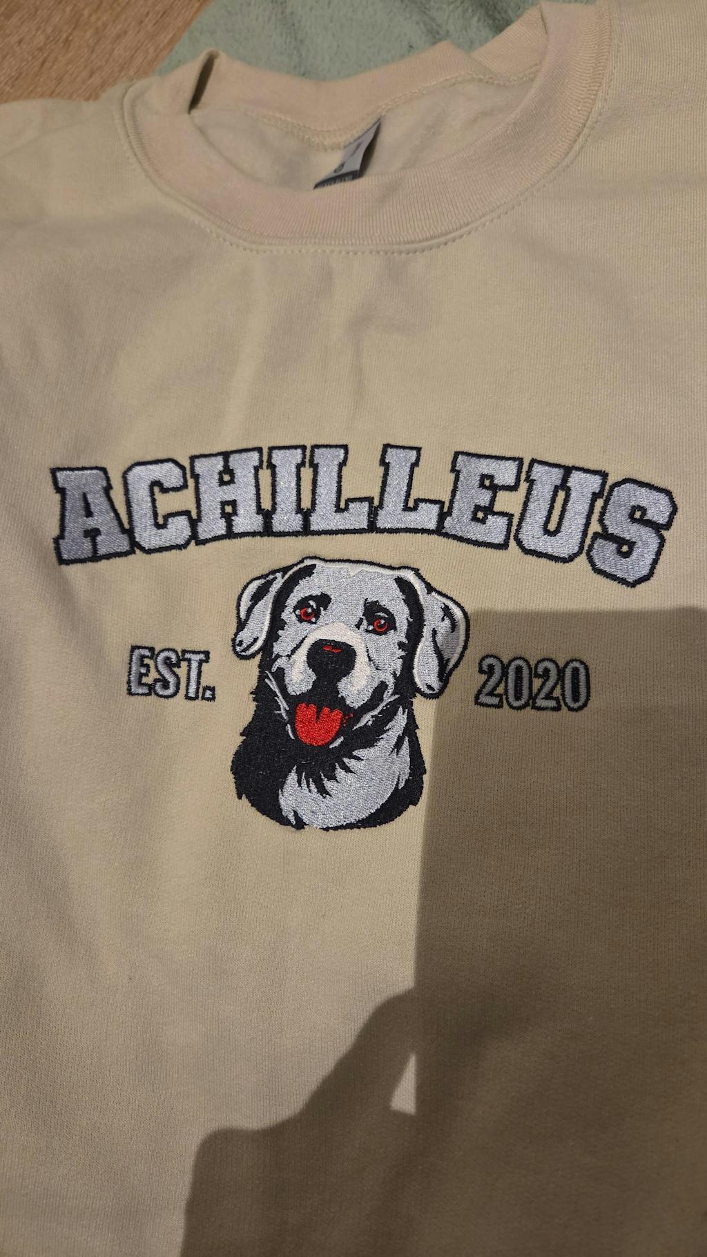 Der pullover ist toll, allerdings wurden die Augen unseres Hundes in rot gestickt und das sieht leider etwas gruselig aus, deswegen nur 3 Sterne.. Das Problem ist, dass nur in 3 Farben gestickt werden kann und da unser Hund auf dem Foto die Zunge raus gestreckt hat, musste mit rot gearbeitet werden :/ wären die Augen nicht rot, wäre ich aber super zufrieden, der Rest sieht wirklich gut aus 👍